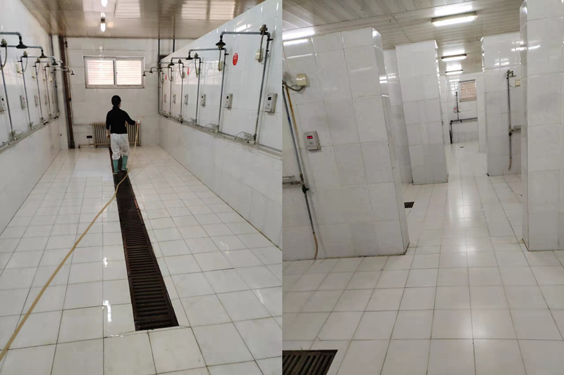 工作人员对浴池消毒消杀